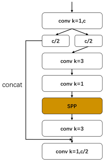 In addition to the CSP structure of the trunk network, we considered combining the SPP structure mentioned above with the CSP module and optimizing it in the network. This KIND of CSP modular SPP structure reduces the amount of calculation resulting from increasing the SPP module and improves accuracy, achieving the purpose of reducing parameters but ensuring accuracy [28]. The improved CSP-SPP module is shown in Figure 3.