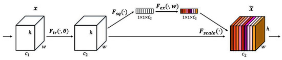 The attention model was originally used in machine translation and has become an important part of neural networks. The attentional mechanism module can pick out helpful features by attaching weights to different concerns within the network. Among many attention modules, the SE module is the classic. This focuses on the relationships between channels so that the model learns only useful channel characteristics. It first reduces the dimension of spatial features to 1 × 1 by global average pooling based on the width and height of feature graphs, as shown in Equation (7). Then, two fully connected layers and nonlinear activation functions are used to establish connections between channels, as shown in Equation (8).