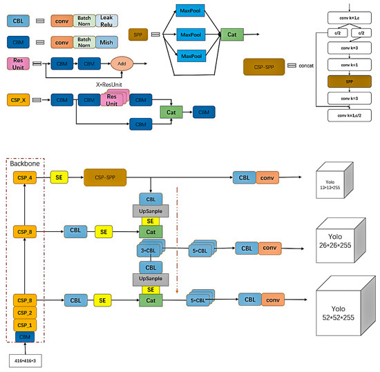 The structure of the detection network is shown in Figure 5. We continued to use the backbone feature extraction network of YOLOv4, and added the SE module after three output layers and after up-sampling to improve positioning accuracy. After that, the backbone part was used with the above-mentioned Csp-spp module to reduce more parameters while improving the receptive field, and finally we used the FPN structure to fuse the features and then output the targe.