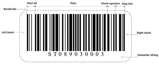 To decode a barcode on the courier sheet, we chose the Zbar algorithm for the decoding operation. The Zbar algorithm is an open-source barcode detection algorithm online. The algorithm can not only read a variety of sources of barcode, such as image files, and videos, but also supports a variety of barcode types, including EAN-13/UPC-A, UPC-E, EAN-8, Code128, Code38, and QR. Our form of bar code was mainly code128. This is shown in Figure 6. Code128 consists of a series of parallel bars and blanks divided from left to right into left margin, start bit, data, validator, end bit, and right margin.