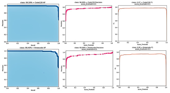 The target detection model was applied to the distribution center for real-time detection, so the detection speed and accuracy were more important evaluation criteria. The experiment used frame rate per second (FPS) as the speed evaluation index. The FPS value reflects the number of pictures that can be processed per second. The higher the FPS, the faster the detection speed. After that, the FPS data was obtained in the above configuration. Finally, it was decided to use the average precision (AP), precision rate (P), recall rate (R), F1-measure (F 1) value, model size and FPS in the detection network to evaluate the network performance. The calculation formulas of , and are expressed as Equations (10)–(12):
