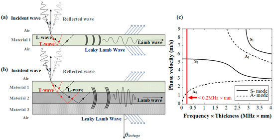 where and denote the wave velocity in air (which is the adjacent medium), and the Lamb wave velocity in the surface of the multi-layered structure (where the leakage occurs), respectively. As can be seen in Figure 1b, similar leaky Lamb waves occur in multi-layered structures. The Lamb waves generated in the multi-layered structure proceed in different layers before leaking, and the angle of the oblique pressure wave is determined by the properties of the layers passed through [22]. Finally, the leaky Lamb waves pass through the whole multi-layered structure and proceed to the loading fluid (i.e., air).