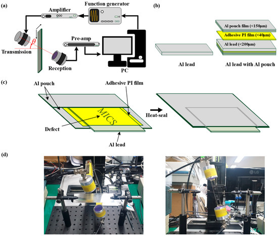 (a) The experimental setup of the air-coupled ultrasonic NDT method. (b) The test pieces used in the experiment. From the left, the Al lead tab, and the Al lead tab sealed with the Al pouch film and adhesive polyimide (PI) film. These structures are all symmetrical. (c) The inhouse Li-ion pouch battery defect model in which a 1-mm piece of paper was inserted as a foreign material. (d) Photographs of the experimental setup.