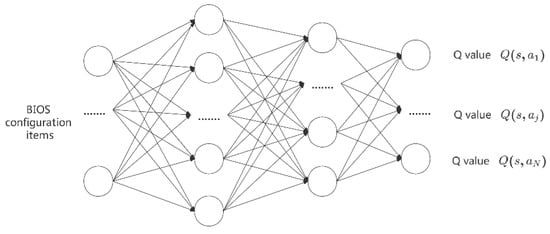 Figure 4 is the -network structure, the input is the BIOS configuration, and the output is the Q value for different actions. For instance, represents the value for selecting the jth action at state . In Section 4.1, we define and restrict actions. Action means to modify only one configuration, and thus, the output dimension of the network is the same as that of the configuration item. At state , to choose the best action in the set of alternative actions, the decision-maker will use a greedy strategy to take the action with the largest value. However, adopting the greedy strategy alone will cause missing the optimal action, so this paper uses the greedy policy to ensure a certain probability of exploration. At the same time, to make up for the low intensity initial search problem, a large value of is set at the beginning of the training of the algorithm, and it decreases according to the decline coefficient , as the training goes on until it drops to the minimum value, as follows: