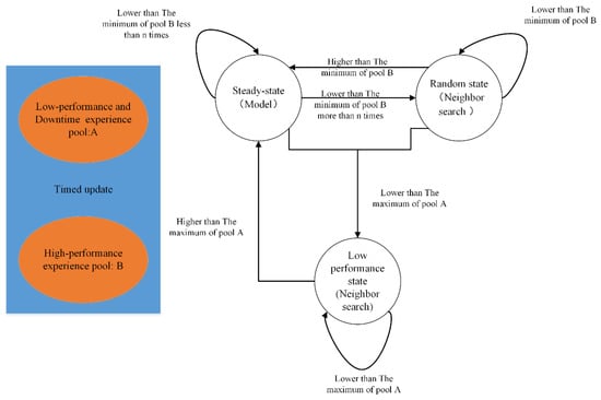 After the first part of the algorithm is executed, some better-performing configurations are obtained, as well as a trained and tuned model. These contents will be used to guide subsequent state-controlled neighborhood searches. As depicted in Figure 5, the two experience pools that continue to update come from the data of the training process. There are three states: steady state, random state, and low-performance state. In the steady state, it uses the model trained above to select an action. In the random state, it will find the past n high-performance experiences based on memory and then perform neighbor searching based on Hamming Distance. In the low-performance state, it will find the first n high-performance experiences from pool B and then search nearby. The process of generating a new configuration for neighbor searching is as follows: (1) Randomly generate a candidate configuration. (2) Calculate the Hamming distance between the candidate configuration and n reference configurations. In the random state, the reference configuration is the past n high-performance experiences. (3) Determine whether more than half of the n distances are lower than the set distance threshold, and if so, generate a new solution; otherwise, repeat (1). At the beginning of the algorithm, the last 5% of the first stage and the downtime configuration are filled into experience pool A, and the first 1% of the configuration is filled into B. The initial configuration is set the same as the first stage and defined as a stable state. Then, state switching is performed according to Figure 5, and each state transition is an iterative process. If the resulting new solution performance is lower than the maximum value of A, it is added to A, and if it is higher than the minimum value of B, it is added to B.