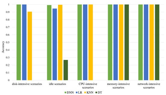 In each scenario, a similar amount of data is collected, with a total of 497,640 combined data. With the help of the Pearson correlation coefficient [38] for feature screening, the features with high correlation are removed, and finally, 38 features remain in Table A1. After dividing the dataset, there are 338,396 pieces of data in the training set, 59,716 pieces of data in the validation set, and 99,528 pieces of data in the test set. As seen in Figure 6, each classifier after training is evaluated using the test set. It was found that the performance of the decision tree is the worst. Its classification ability for hard disk-intensive scenarios, idle scenarios, and CPU-intensive scenarios is too poor, resulting in low accuracy. The other three algorithms have good classification capabilities for CPU-intensive scenarios, memory-intensive scenarios, and network-intensive scenarios and can achieve close to 100% accuracy. The performance difference between these four algorithms is mainly reflected in the classification ability of hard disk-intensive scenarios and idle scenarios. According to the results, DNN has the best classification ability, with an accuracy rate of 99.7%.