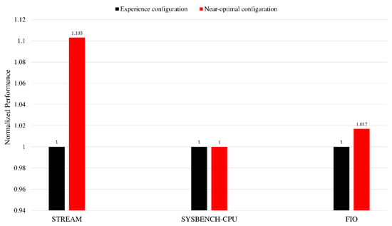 We also perform static tuning on several other benchmark software, and the results are shown in Figure 11. The performance metric of Sysbench-CPU is the 95th percentage of the prime calculation event latency. The performance metric of Fio is the IOPS (input/output operations per second) under the random-read workload. For the Sysbench-CPU benchmark, there is almost no room for improvement of the empirical configuration. The main reason is that for the performance of the core, the empirical configuration has reached the optimal solution, and it is difficult to further optimize it further. In addition, although kunpeng920 provides a lot of configuration items, only some configurations are selected for the experiment in this article. Considering that the configurations adjusted in this article are mainly related to LLC and HHA, there is little opportunity for adjusting these configurations to improve the core performance but a greater opportunity for optimization in computing and communication scenarios, such as memory. In the follow-up work, energy efficiency can be used as the tuning index for scenarios where there is little room for performance improvement. Additionally, more memory-type benchmarks can be added for fine-grained scenario classification and static tuning.