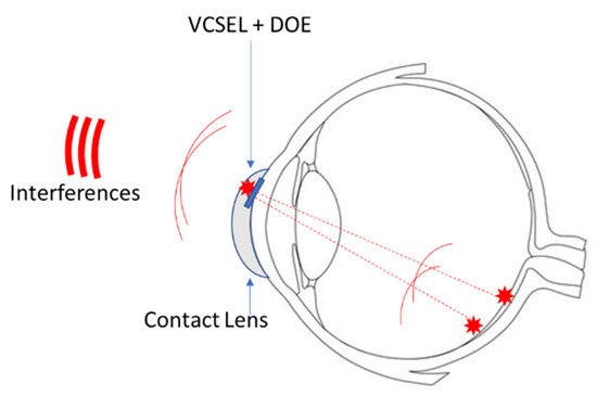 In the second of the possible configurations, the laser is combined with a diffractive optical element (DOE) to create one or two spots on the retina. The light reflected from these two spots will create an interference pattern that can be detected by quadratic sensors located around the eye (Figure 8). These detectors are placed around the eye on the eyewear to keep the direction of sight free. In this case, knowledge of the gaze direction will help in compensating for the variable alignment of the eye with the detector.