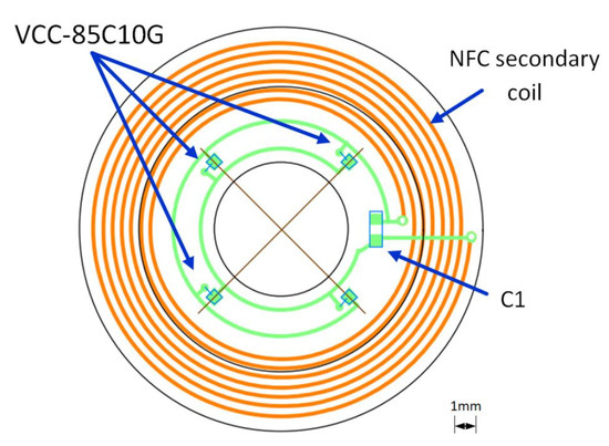 On-lens computing can be implemented using a low-power integrated circuit (IC) comprising the necessary blocks required to monitor the sensors (e.g., photodiode and/or interferometer), activate the VCSEL, compute the metrics, transmit the metrics to the eyewear via an NFC link (see [15]), and finally harvest energy,. Off-the-self ICs comprising all the necessary blocks exist. For instance, the NHS3152 from NXP is an NFC-powered IC dedicated to use in smart autonomous sensors. The IC includes a low-power Cortex-M0+ microcontroller, various data converters including a current-to-digital converter (I2D), and a near-field communication and energy-harvester block (power management unit, PMU). Analog and digital ports are also available to connect sensors and actuators. Specific digital pads on the NHS3152 can source up to 20 mA, more than enough to supply the VCSEL. The IC also has I²C and SPI ports to connect smart sensors. The microcontroller can implement a finite-state machine to sequence the lens operation (control the on/off VCSELs (Lasermate VCC-85C10G), measure the photocurrent of the infrared photodiode (Vishay T1170P) to determine the pupil diameter, and communicate with the eyewear or the headset). The NHS3152 consumes about 150 µA under a 1.8 V supply when clocked at 250 kHz, which is fast enough for our application. The 850 nm VCSELs have a threshold current of 0.5 mA. At 850 nm, the relative sensitivity of the T1170P photodiode is 0.95. Figure 9 shows a simplified block diagram of one possible implementation of the multimodal SCL; the supply voltage biasing the photodiode and the VCSELs is provided by the energy harvester. To limit power consumption, the VCSELs are sequentially turned on or off, with a low-frequency (~1 Hz) low duty cycle (<10%) control signal. The VCNL36825T proximity sensor used as a refractometer provides the digitized value of the measured photocurrent, and consumes 100 µA. The dimensions of all the elements are compatible with encapsulation into an SCL as shown in Figure 10. Table 1 gives the dimensions of each part; as seen, the thickest parts, the NHS3152 and the proximity sensor, are only 0.5 mm thick.