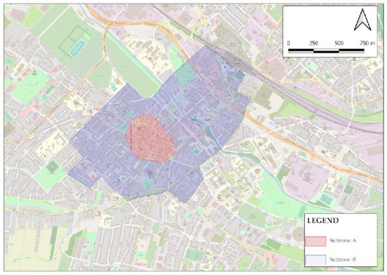 The paid parking zone (PPZ) has been operating in the city of Gliwice since 2012, which is divided into Subzone A (29 streets) and Subzone B (60 streets) (Figure 1) [54]. The market is located in the area designated by Subzone A of the PPZ. On the market and around it are mainly restaurants, cafes, commercial and service buildings, etc. In turn, in the area of subzone B, there are mainly commercial and service buildings, the City Hall, the Silesian University of Technology, etc. The area covered by the PPZ is the very center of the city, with a large number of traffic generators