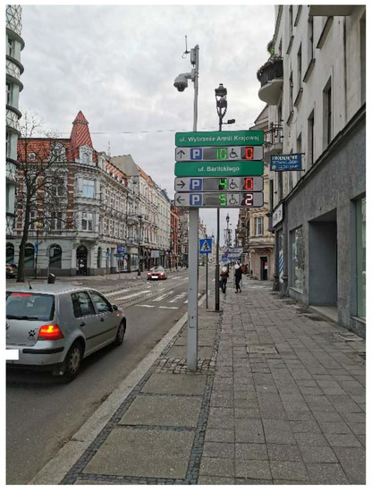 Magnetic sensors were installed in 751 parking spaces in their surfaces to detect the presence of a vehicle (Figure 2—a black circular object in the center of a parking space). A vehicle detection system in parking spaces allows for the monitoring of the use of parking spaces in real time and makes it easier for drivers to search for vacant parking spaces. The magnetic sensor, based on the continuous measurement of the Earth’s magnetic field, detects the vehicle by disturbing the magnetic field generated by the induction loop. Then, several concentrators located within the paid parking zone collect data from sensors. Through a fiber-optic network, data from the concentrators are sent to the controller, which displays information about vacant parking spaces on the dynamic parking information board (Figure 3). The dynamic parking information board allows providing information about available parking spaces to the driver so that he can make decisions about the area where he wants to park. The place of installation of the dynamic parking information board should be the transit road in the parking, from which there are streets with parking spaces. A driver going through the transit road sees several dynamic parking information boards from a distance and, based on their indications, can decide to choose an area with parking spaces. In addition, in 2019, the ITS Gliwice application was launched, in which drivers are provided with information about the number of vacant parking spaces in a given area.