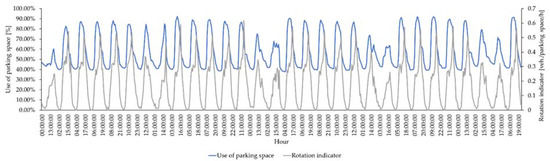 The values of the use of parking space and the rotation indicator on non-working days are lower than on working days and on the days immediately before and after them. Table 1 presents a list of days on which a decrease in value is noticeable to the corresponding days in particular months of 2019, along with information about public holidays occurring on those days. In February, March, July, September, and October, there are no days when these values can deviate. There was no public holiday during these months. On 1–2 June 2019 (Saturday and Sunday), the values of the use of parking space and the rotation indicator are higher than the average values for Saturdays and Sundays in June 2019. The increase in these values on June 1 may be related to the occurrence of a child’s day on that day in Poland. In addition, on 1–15 December 2019, the use of parking spaces was not less than 50%. However, on 16 December 2019, in the night and morning hours, this value drops below 50%.