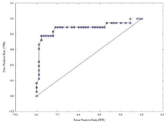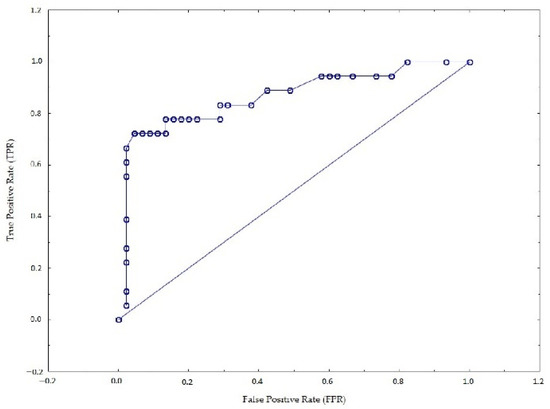 The ROC (receiver operating characteristic) curve was determined for the developed models. The ROC curve makes it possible to visualize the sensitivity and specificity of the model. Based on the ROC curve, it is possible to find the optimal point that maximizes the value of sensitivity and specificity. The AUC (area under the curve) is calculated under the ROC curve. AUC values range from 0 to 1, and the closer the value is to 1, the better the model [64]. In the case of model 1, the area under the curve is approximately 0.88 (Figure 6), while in model 2, it is approximately 0.86 (Figure 7). The comparison of the results of both models shows that model 1 better predicts drivers’ subjective assessment of the ease of finding a vacant parking space in an area equipped with vehicle detection devices than model 2. However, with a slight difference between the AUC values for models 1 and 2 and the fact that in model 1, the p-value of 2 variables is greater than 0.05, model 2 was considered a better fit.