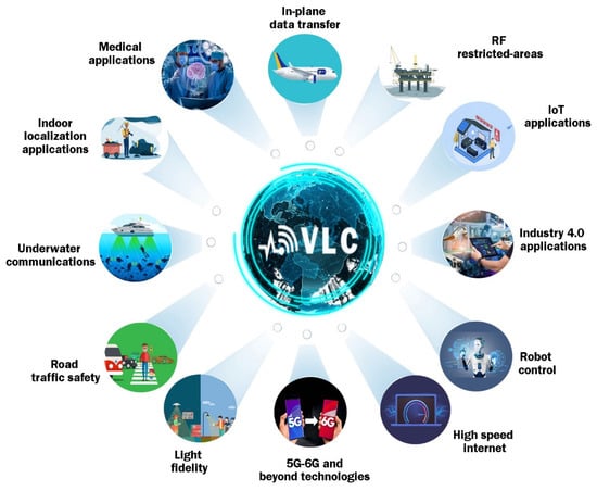 The high potential of VLC technology has been also confirmed by its standardization by the IEEE organization. Thus, soon after the first VLC prototypes became available, VLC technology was standardized by the IEEE 802.15.7 standard in 2011 [4,5,6], and several other standard updates became available later [7,8,9]. Following this favorable trend, VLC technology began developing, and thus, numerous applications have been identified. Hence, right from the beginning, the main application of VLC has been providing extremely high data rate wireless connections, being suitable for broadband internet [10,11,12]. In this area, VLC technology proved capable of ensuring tens of gigabits per second data rates [10], with connections above 100 Gb/s being envisioned [11]. Consequently, VLC began being considered a very promising candidate in 5G–6G applications [12,13,14,15,16]. In this area, VLC is extremely suitable due to the spatial reuse capabilities that recommend it for the small cell concept. In turn, 5G–6G technologies can benefit from higher-than-ever data rates, extremely low latencies (<1 ms), and wide coverage.