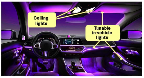 Another aspect associated with modern people’s habits is related to their personalized items. Nowadays, people like and are willing to pay for unique or limited-edition options. In the automotive area, this translates into cars that have unique looks and personalized features, such as motor tuning, improved exterior design, and different kinds of interior features. When discussing interior car improvements, an important feature is provided by the ambient lighting system. Thus, current manufacturers integrate their series vehicles with tunable lighting functions that enable the user to personalize the interior ambiance of the car. These features provide a great aesthetic effect and enable car owners to illuminate the interior of the car in accordance with their preferences. Thus, with the help of RGB LEDs, the entire spectrum of colors can be generated according to users’ choices. Figure 2 illustrates such an example.
