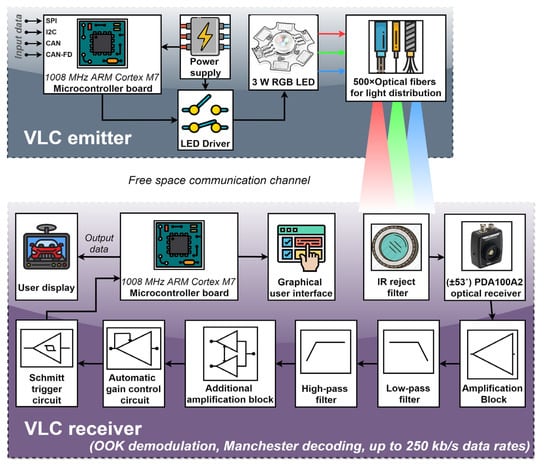 Figure 3 presents the diagram of the proposed VLC system, englobing the VLC emitter and the VLC receiver. As one can see, a 1008 MHz ARM Cortex M7 Microcontroller board is the central element of the in-vehicle VLC emitter. The microcontroller deals with the data transmission function, and thus, it transforms the data to send into a bit stream. Therefore, the microcontroller is responsible for data processing, data encoding, data modulation, and data frame building. Due to its simplicity and decent performance, the VLC emitter uses on–off keying (OOK) modulation, being in accordance with the specifications of the IEEE 802.15.7 standard. Next, in order to prevent any flickering, the VLC emitter must use a run-length-limited (RLL) code that guarantees that logic level “1” and level logic “0” have the same light intensity. In this case, due to previously demonstrated performances, the classical Manchester code was used. In terms of data rate, the current version of the in-vehicle VLC receiver enables data rates up to 250 kb/s. Nevertheless, megabits-per-second data rates will soon be available. The data frame begins with a synchronization frame that informs the VLC receiver that a new message is being received. Next, the message header provides the VLC receiver with information concerning the modulation technique, the coding technique, the data rate, and the length of the data message. Then, the frame contains the data to be transmitted, followed by a stop byte that informs the VLC receiver that the message has come to the end. Last, a short inter-frame space is integrated to separate neighboring frames. The microcontroller board can generate its data to be transmitted or it can be interfaced with a different device that provides the data to be transmitted through I2C, SPI, or CAN interfaces. Next, once the data frame is ready to send, the microcontroller controls the LED’s light intensity through an LED driver. Thus, a light beam containing the data is generated. From this point, the light is introduced into the optical fibers, where it travels throughout the fibers until it reaches the vehicle rooftop, providing in-vehicle ambient lighting and also wireless data transfer. Next, the light leaves the optical fibers and travels through the free space optical channel carrying the information toward the VLC receiver. Figure 4 shows the practical implementation of the in-vehicle VLC emitter, showing the intermediate implementation steps and also the final in-vehicle ambient lighting system with data transmission capabilities, whereas Table 1 summarizes the VLC emitter parameters.