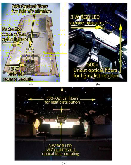 Although the VLC emitter is not the central element in the design of a VLC system, this part is very important for users. From this perspective, the IEEE 802.15.7 standard for optical communications using visible light clearly stipulates that the VLC function is a complementary function of the lighting device and that the data transmission ability should not affect, influence, or limit the primary lighting function. Thus, in order to comply with these regulations, VLC systems must not induce any noticeable or perceivable flickering and should include light dimming functions if the original application requires it. For this purpose, but also to reduce the implementation cost, optical fibers were chosen to redirect the light within the car. Thus, instead of using 500 micro-LEDs, the VLC emitter is using a 3 W RGB LED and 500 optical fibers that carry the LED light to 500 points of the passenger compartment. This solution generated a very user-attractive design while offering a lower cost with respect to the case when multiple LEDs would have been chosen.