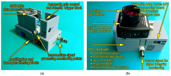 Visible light communications receiver prototype: (a) lateral view before integrating the optical receiver; (b) complete VLC receiver prototype.