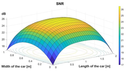 Figure 7 shows the SNR distribution modeled in the car. As one can see, the estimated SNR has very good values, between 17 and 26 dB, so the expectation in this scenario is to have an extremely low BER value for the entire covered area.