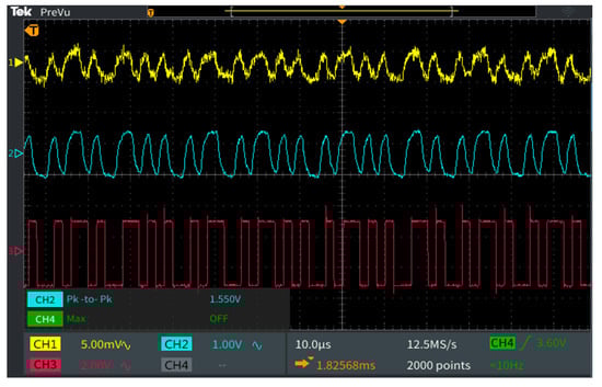 Oscilloscope screen showing the signal processing plan at the VLC receiver level: Channel 1 (yellow) shows the output of the transimpedance amplifier adjusted at 10 dB gain; Channel 2 (cyan) provides the output of the amplified signal, after 1 kHz–1 MHz band-pass filter that will be feed into the Schmitt trigger circuit; Channel 3 (magenta) displays the final data signal that will be provided to the microcontroller for the data extraction process.