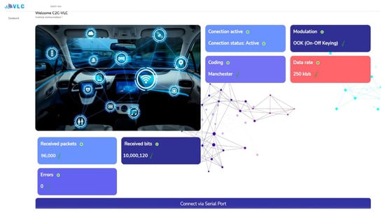 As shown in Section 1, VLC technology has numerous applications in various areas. These areas mainly include indoor applications, industrial applications, underwater applications, and automotive applications. In the various indoor applications, the main purposes were to improve the data rates, and thus, gigabits per second data rates have been demonstrated in laboratory conditions [10,11], and on the other hand, to develop mechanisms that enable multiple users’ coexistence and inter-cell handover [46]. The area of automotive applications is also a very active VLC research area. In this domain, the work was focused on developing vehicle-to-vehicle, vehicle-to-infrastructure, and infrastructure-to-vehicle VLC systems, focusing on improved robustness and noise resilience, medium to long communication ranges, and low latencies [29,30,31,32,33,34,35]. The use of the VLC in the automotive area has the potential to significantly improve road traffic safety and also to generate important investments and progress, considering the importance of the automotive economic sector. Additionally, developing new automotive VLC applications is essential, facilitating the popularization of VLC technology to the general public. In this context, the concept introduced by this article is innovative and it is envisioned for a domain that can generate important benefits for car manufacturers but also for car users.