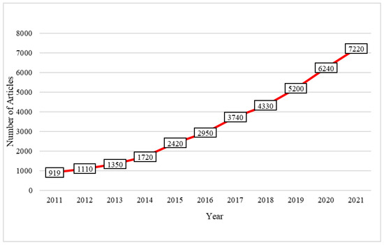 The number of articles on wearable sensor-based technologies for fall risk assessment in older adults published between 2011 and 2021, retrieved from Google Scholar.