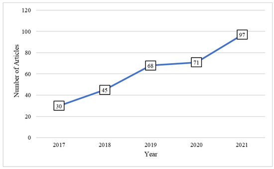 We searched three databases (PubMed, Scopus, and Web of Science) to identify potentially relevant articles between November 2017 and June 2022. Figure 2 shows the number of published articles in this period, indicating a rapid upward trend. The search terms were: (“accelerometer” OR “wearable sensors” OR “gyroscope” OR “magnetometers”) AND (“fall” OR “fall risk assessment”) AND (“gait analysis” OR “signal processing” OR “feature extraction”) AND (“aged” OR “geriatric” OR “gerontology” OR “senior” OR “elder” OR “old” OR “older adult”) AND (“general” OR “community-dwelling”). These search terms were validated by reviewing the retrieval of representative articles [32,33].