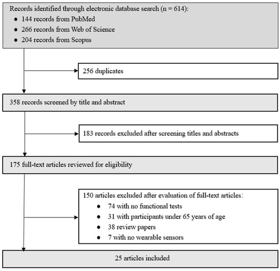 Figure 3 shows the literature search and review process. We retrieved 614 articles identified from PubMed, Scopus, and Web of Science. After the exclusion of 256 duplicate articles, 358 were screened by reviewing the titles and abstracts. Finally, 175 potentially relevant articles were reviewed in full-text, of which 25 met the inclusion criteria and were analyzed.
