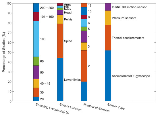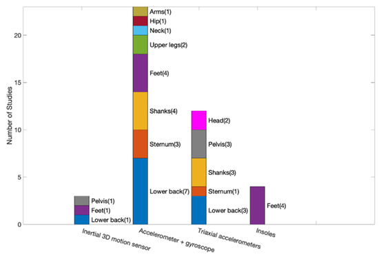Figure 4 summarizes the sensor information available in the 25 selected articles. Four types of sensors have been used: pressure sensors, accelerometers, gyroscopes, and inertial three-dimensional motion sensors. Specifically, 80% of the included studies used a combination of two or more sensors to capture motion signals. Fourteen studies used an IMU composed of an accelerometer and a gyroscope to capture motion signals, which appeared to be a common choice.
