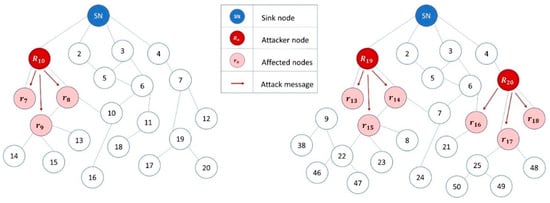 Protocol-specific attack simulation in RPL-based IoT networks simulated in Cooja. The attacker is located at position 10 in the left-hand side network, while two attackers are located at positions 19 and 20 in the right-hand side network.