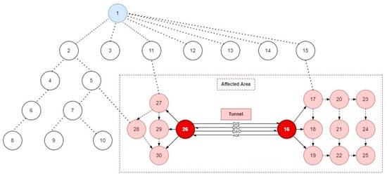 The wormhole attack is simulated from the SN-inherited attack category. The attack model is presented in Figure 3, where two nodes, 16 and 26, form a tunnel between each other by probing using DIS messages and then sending and receiving DIO, DAO, and acknowledgment messages. In the attack model, malicious nodes are placed near the victim nodes to observe the attack effect. Consequently, the neighbor nodes 17–25 join the attacker node 16 by selecting it as a parent due to its illegitimate preferred parent characteristics, such as decreased rank value and shortest path to the root node. Similarly, nodes 27–30 also join the attacker node 26 for the same reasons mentioned earlier. Algorithm 2 demonstrates the simulation of SN-inherited wormhole attack in the RPL-based IoT network in the Cooja simulator.