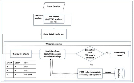 After simulating our network models in different scenarios, the radio message tool was used to sniff and collect the radio messages transmitted between the nodes that would be analyzed with a 6LoWPAN analyzer with a PCAP feature incorporated into the tool. Figure 4 presents the workflow of the data collection module. Subsequently, the collected data were processed by the Wireshark software and saved in comma-separated values (CSV) format.