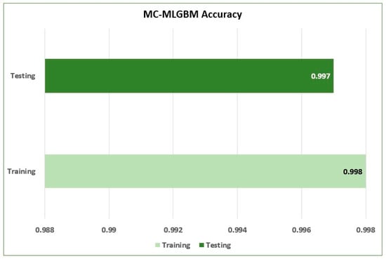 The results obtained from the experiment exhibited promising results in both classic ML-based evaluation metrics and multiclass-related metrics. The model achieved a training accuracy of 0.998 and a testing accuracy of 0.997 for the detection of both types of attacks, as shown in Figure 5.