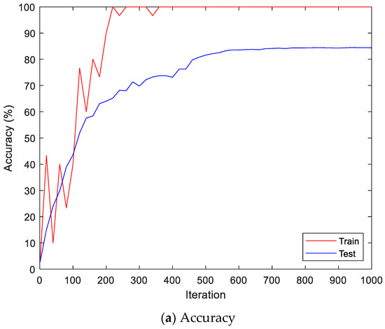 Figure 9 shows the accuracy and loss of the Angeles EMG dataset with the scalogram and CNN-based individual identification model for training and testing data, respectively. Figure 10 shows the accuracy and loss of the Angeles EMG dataset with the feature extraction and LSTM-based individual identification model for training and testing data, respectively. As shown in Figure 8 and Figure 9, we obtained good performance for testing the dataset as the number of iterations increased.