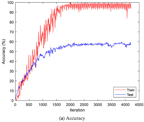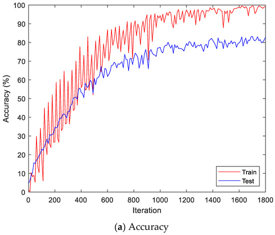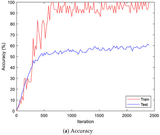 Figure 13 shows the accuracy and loss of the CU-EMG-ECG dataset on the scalogram and CNN-based individual identification model that uses EMGs. Figure 14 shows the accuracy and loss of the CU-EMG-ECG dataset with the feature extraction and LSTM-based individual identification model for training and testing data, respectively. As shown in Figure 13 and Figure 14, we obtained good performance for testing the dataset as the number of iterations increased.