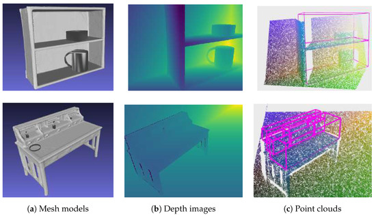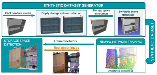 In order to apply a deep learning approach, which requires large annotated datasets for training, we address in this work the generation of synthetic scenes and the automatic annotation of the bounding boxes of the storage space in these scenes. In [15], the authors created a large synthetic dataset of indoor 3D scenes with dense per-pixel annotations. In [16], a physics engine was used to randomly generate scenes from metrically scaled ShapeNet [1] objects. Finally, they obtained rendered RGB-D scenes and their ground truth annotation in a large video dataset. The authors of [17] manually created their own large dataset of synthetic 3D scenes with dense occupancy and semantic annotations. These 3D scenes contain 84 object categories, including furniture to which clutter was added to the shelves under supervision. In [18], ATISS, an autoregressive transformer architecture for creating indoor environments, based on room type and floor type, was presented. The input to the proposed model is a collection of 3D labeled bounding boxes of the scene objects with their corresponding room shapes. The output is the realistic furnished room with objects contextually belonging in a certain room type. However, these datasets were not suitable for network training in our research because they do not contain information about the storage space bounding boxes. We provide a dataset containing models and depth images of storage furniture with associated bounding boxes of the storage space, which was used for neural network training. This dataset was obtained by the proposed algorithm for automatic detection of empty spaces on voxelized 3D models, which does not require training. The whole process presented in our work is fully automatic and does not require any manual labeling.