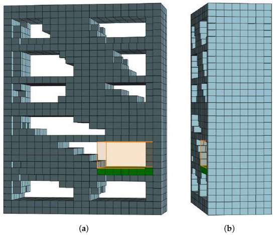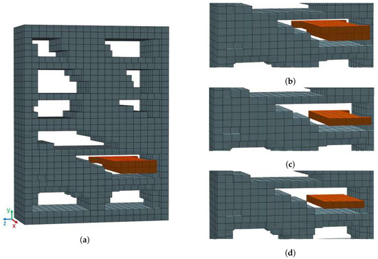 Example of voxelized storage furniture model (bookshelf) with detected free space core (FSC—orange voxels). (a) Front view of furniture model with selected FSC (b) FSC zoomed, (c) One FSC layer in y-axis direction, (d) FSC layer adjusted.