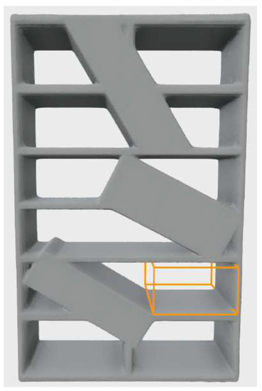 Finally, the storage surface core is dilated by the occupancy distance of its cells, creating a bounding box of the usable storage surface. By adding the height of its storage volume candidate to the storage surface, the algorithm constructs a bounding box of an empty volume, as shown in Figure 4. If this bounding box is the largest empty storage volume candidate for a particular coordinate axis, it is classified as the storage volume candidate for that axis. The described process of storage volume candidate detection for each axis is summarized in Algorithm 2. After proposing three empty storage volume candidates for a given FSC (one for each axis), the algorithm classifies the largest of them as a storage volume.