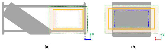 The detected bounding box is depicted with an orange rectangle. Dilating or contracting that bounding box by would create green or blue bounding boxes, respectively. The highlighted volume between the blue and green bounding boxes contains mesh vertices that enclose the observed storage volume: (a) Front view, (b) Side view.