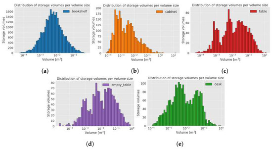 The result of our method could possibly be used with the planning algorithms proposed in [6,31]. A push planning algorithm proposed in [6] selects a sequence of actions to create space for the placement of objects. The objects have a shape, position, and orientation in 2D. The height of an object and the height of the storage volume are not considered. On the contrary, in the scene generation algorithm proposed in our paper, the height of the storage space bounding box and the heights of the objects are taken into account when placing objects on the shelves, that is, when creating clutter, and in the collision avoidance of objects in 3D. A data-driven method described in [31] was developed for arranging objects that automatically fill empty spaces on shelves with a single exampler to create arrangements. Their method creates a variety of style preserving arrangements that scale to different cabinet sizes and confirm style preservation by the user. Our algorithm could be used to detect storage volumes to which the referenced object placement method could be applied.