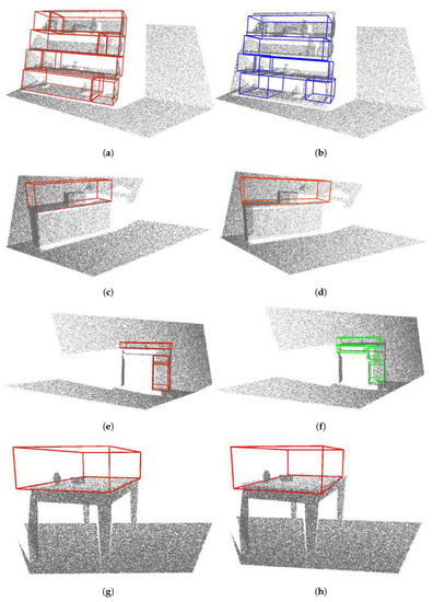 Examples of storage volumes in depth images contained in a real dataset. The left column shows ground truth annotation of storage volumes in the selected furniture classes. The right column shows the storage volumes predicted in these furniture models by the VoteNet detector. (a,b) Show a close-up view of a bookshelf, (c,d) Show a bookshelf seen from a distance, (e,f) Show a close-up view of a cabinet, (g,h) Show a cabinet seen from a distance.