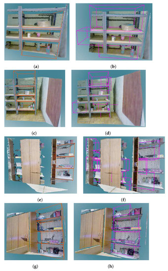 High recall was obtained for the scenes Kitchen from Home 2 and Cabinet from Office 2. This is because these scenes contain relatively small numbers of annotated storage volumes. All ground truth bounding boxes in these scenes were found, resulting in high recall, but some false positives also occurred (Figure 14f), resulting in somewhat low precision.