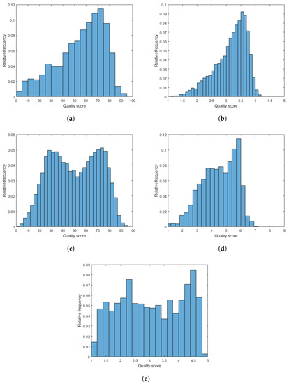 The empirical distributions of quality scores in the applied IQA databases. (a) CLIVE [21], (b) KonIQ-10k [22], (c) SPAQ [23], (d) TID2013 [24], (e) KADID-10k [25].