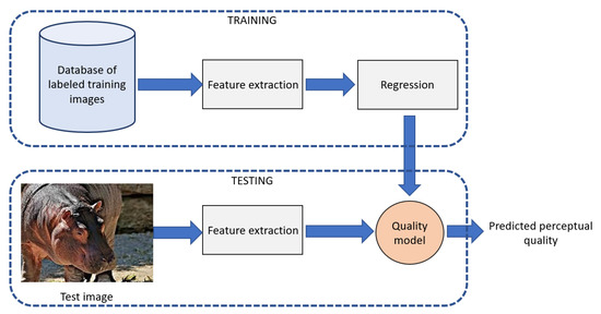 The high-level overview of the proposed NR-IQA algorithm is depicted in Figure 2. It can be observed that the proposed method is built upon two distinct steps. In the first, training step, local features are extracted from a database of quality labeled, training images. Next, a regression model is trained based on them to obtain a quality model. This model is used to estimate the perceptual quality of a previously unseen image in the testing step.
