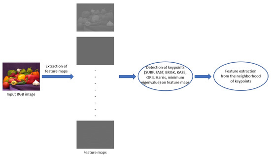 Image distortions influence the human visual system’s (HVS) sensitivity to local image structures, such as edges or texture elements [68]. For that reason, many NR-IQA methods have been proposed [69,70,71] in the literature to compile a quality model from them. However, edge information or local binary patterns are not always able to provide powerful feature representation for NR-IQA. Therefore, in this study, an application of local feature descriptors and HVS-inspired filters are investigated thoroughly to extract quality-aware local features and compile a powerful feature representation for NR-IQA. Figure 3 depicts the general process of local quality-aware feature extraction. First, the input RGB image is filtered by a set of HVS inspired filters to create feature maps. On these maps, local keypoints are detected by local feature descriptors (such as SURF [72]). Finally, feature extraction is carried out from the neighborhoods of the detected keypoints.