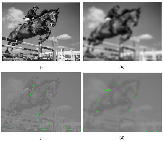 Illustration of Bilaplacian feature map and the detected FAST keypoints on two different distortion levels. (a) Luminance channel of pristine image , (b) Luminance channel of distorted image , (c) , (d) .