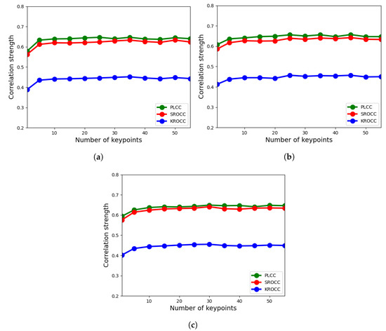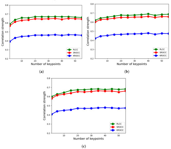 Ablation study for LFD-IQA-SVR: number of detected keypoints vs. correlation strength. (a) block size, (b) block size, (c) block size.