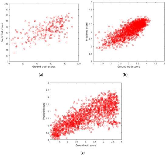 Ground-truth scores versus predicted scores using the proposed LFD-IQA-SVR method on (a) CLIVE [21], (b) KonIQ-10k [22], and (c) KADID-10k [25] test sets.