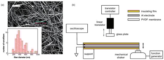 (a) Scanning electron micrograph of the electrospun PVDF nanofibers. (The scale bar on the top left corner is 10 μm.) The lower inset shows the histogram of the nanofiber diameter distribution with a mean value around 450 nm. (b) Illustration of the experimental setup. The sensing element is composed of the piezoelectric PVDF membrane, sandwiched between Al electrodes and protective insulating films. One end of the sensing element is fixed on a support structure and the other end is connected to a mechanical shaker. While the membrane is driven to oscillation, the resulting piezoelectric voltage is monitored with an oscilloscope. To observe the piezoelectric response of the membrane under the static external load, the mechanical contact is established by approaching the glass plate, attached to a linear translator, onto the PVDF membrane.