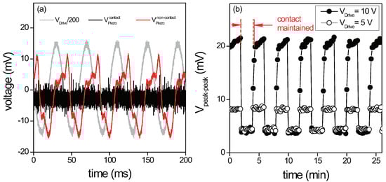 (a) When no external contact is made, the freely oscillating PVDF membrane, driven with constant amplitude, generates a significant piezoelectric voltage signal at the frequency of the driving signal . However, once the contact is established and prevents the membrane from the continuous vibration, no periodic piezoelectric signal is detected. For comparison with the piezoelectric signal, the driving voltage is divided by a factor of 200. (b) Peak–to–peak piezoelectric voltage signal at 25 Hz, measured under the repeated application of the mechanical contact, for two different drive voltages of 5 and 10 V. Without contact for a period of 120 s, the large constant piezoelectric signal can be measured. However, for the contact duration of 120 s, only the voltage at the level of the electrical noise is detected. When this measurement is performed over 26 min, the output signal curve shows constant switching between the contact and non-contact at each repeated cycle.